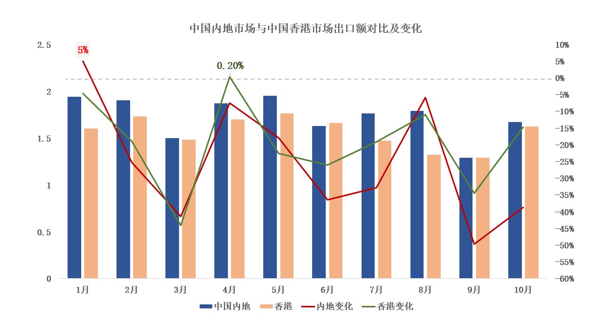 中国内地市场与中国香港市场表现也有差距,截至今年10月份,中国内地市场瑞士腕表出口额平均跌幅为25.11%,中国香港市场瑞士腕表出口额平均跌幅为19.62%。不仅如此,中国内地市场10月份的出口额为1.67亿瑞士法郎,距离年初的1.94亿瑞郎仍有两千余万瑞郎的差额,反观中国香港市场,10月份的出口额为1.62亿瑞郎,相较于1月份年初的1.6亿瑞郎,不降反增,可见香港市场的回血速度更快。