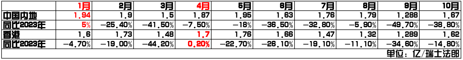 但如果将2024年的数据与2022年相比较,全球排名前十的市场中仅有中国内地市场出口额在大幅下跌,其他市场均有增长趋势,中国内地市场2024年10月份的出口额同比2022年10月份21.78亿瑞士法郎出口额降幅高达19.6%。复苏之路充满挑战