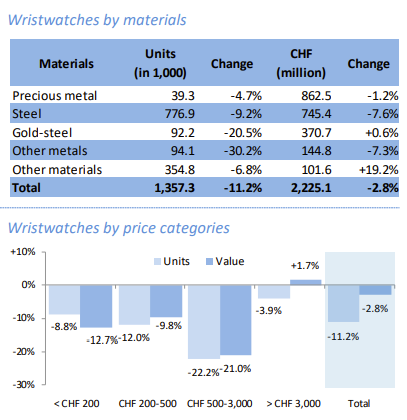 在价格方面,高端腕表展现出了强大的市场吸引力。3000瑞郎以上的手表出口量虽然下滑了3.9%,但出口额却同比增长了1.7%。可见,尽管市场整体表现不佳,但是高端腕表市场依旧保持着稳定的需求。相比之下,中低端腕表市场则面临更大的压力,500~3000瑞郎的手表出口量同比下滑22.2%,出口额同比下滑21%;200~500瑞士法郎的手表出口量同比下滑12%,出口额同比下滑9.8%;价格低于200瑞士法郎的手表出口量同比下滑8.8%,出口额同比下滑12.7%。