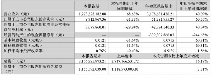 2024年三季度,公司营业收入为12.74亿元,同比增长68.63%;归属于上市公司股东的净利润为871万元,同比下降31.33%;扣除非经常性损益后的净利润为808万元,下降29.94%;基本每股收益为0.0121元,下降31.64%。在资产负债方面,截止三季度末,公司总资产为31.57亿元,较上年末增长16.18%;归属于上市公司股东的所有者权益为11.56亿元,增长3.31%。